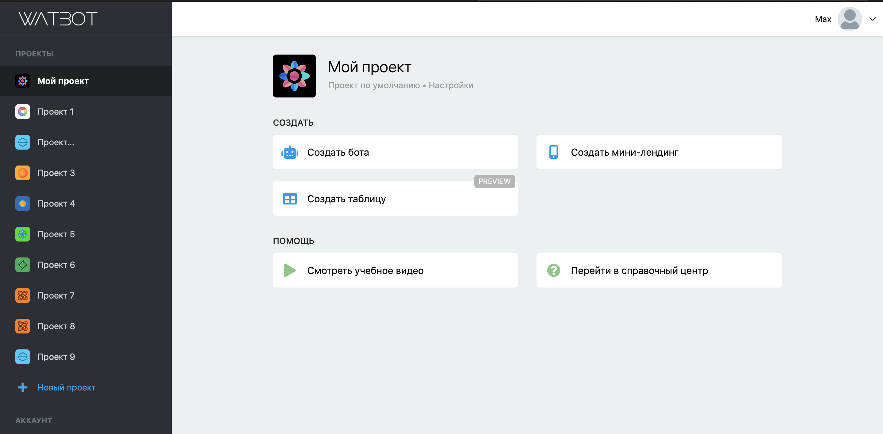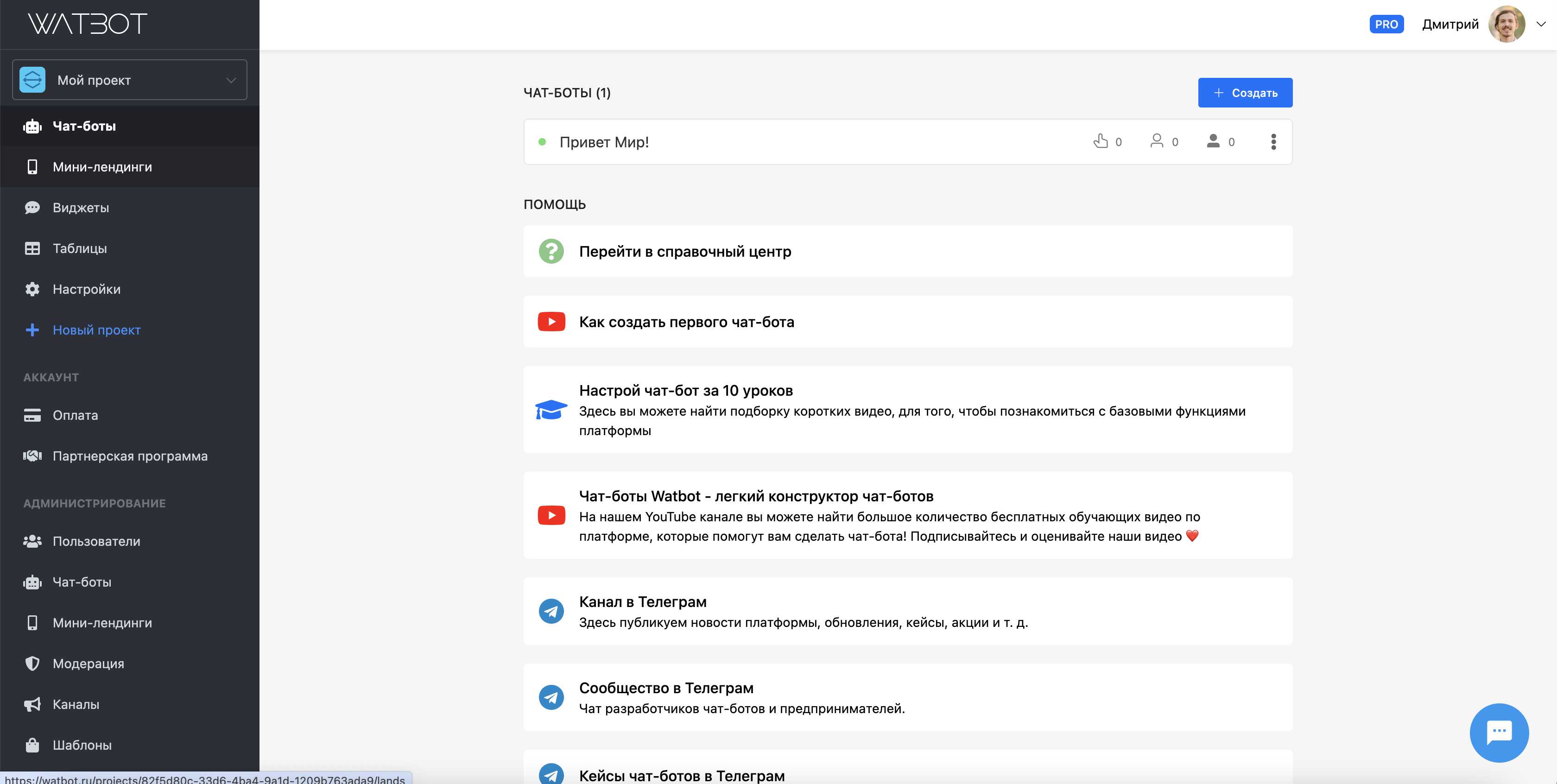 Каждый проект может состоять из нескольких чат-ботов и мини-лендингов