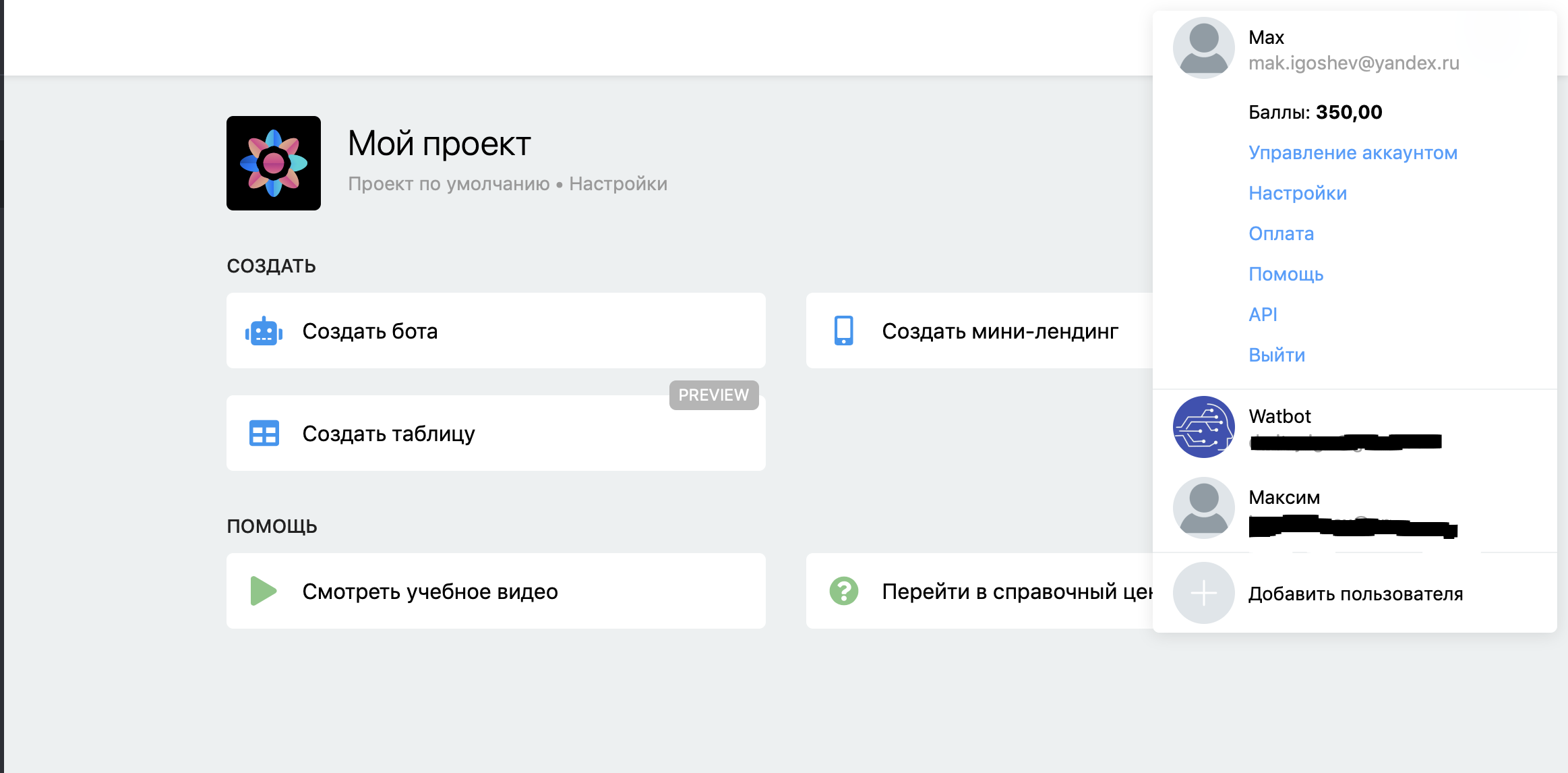 В правом верхнем углу можно нажать на кнопку с именем и аватаркой аккаунта и увидеть баланс аккаунта, тут можно зайти в настройки аккаунта, управлять тарифом аккаунта, перейти в справочный центр, открыть документацию API, выйти из аккаунта, переключаться между аккаунтами и добавить нового пользователя