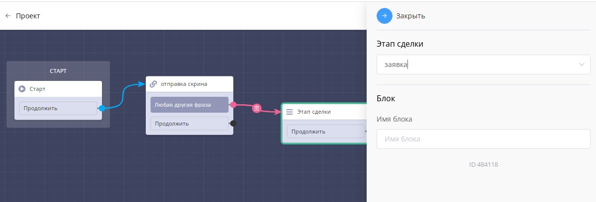 Подходит для чат-ботов с кэшбеком. Например, сначала вы просите прислать скриншот отзыва. После отправки через блок "этап сделки" отправляете заявку на этап "скриншот отправлен". Далее в срм менеджер разбирает все заявки с данного этапа, проверяет что всё верно и если да, отправляет кэшбек.&#x20;