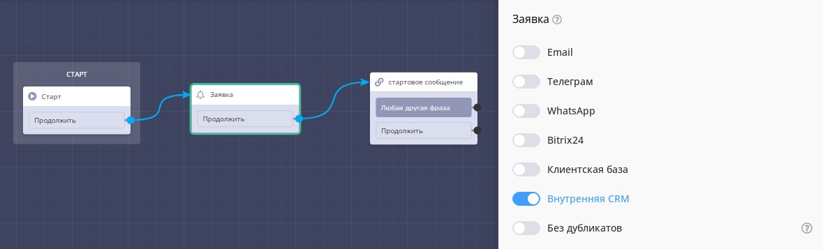 Если вы хотите знать, что кто-то зашёл в ваш чат-бот, то добавьте сразу после блока "старт" блок "заявка", указав на какой канал связи вы хотите получать уведомления.&#x20;