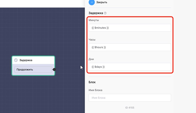 Данный блок позволяет отправить сообщение через указанный промежуток времени. На данные момент минимальный интервал - 1 минута.